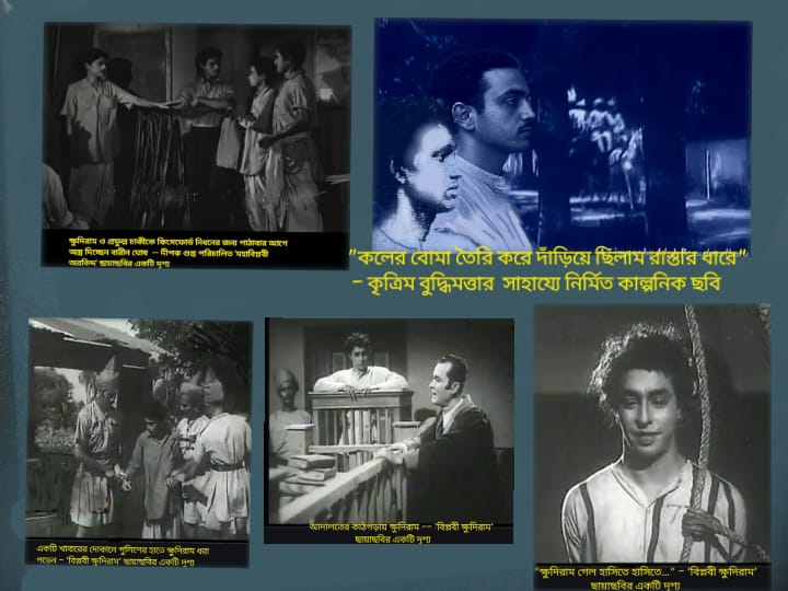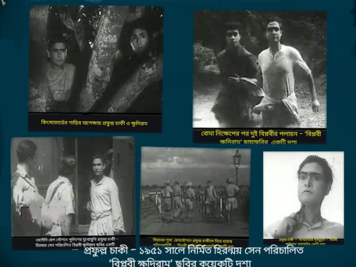 নিচে : (১) রেল স্টেশনে পুলিশের মুখোমুখি প্রফুল্ল চাকী (২) বিহারের পুশা রেল স্টেশনে প্রফুল্ল চাকীকে ঘিরে পুলিশবাহিনী (৩) চলচ্চিত্রে প্রফুল্ল চাকীর চরিত্রাভিনেতা