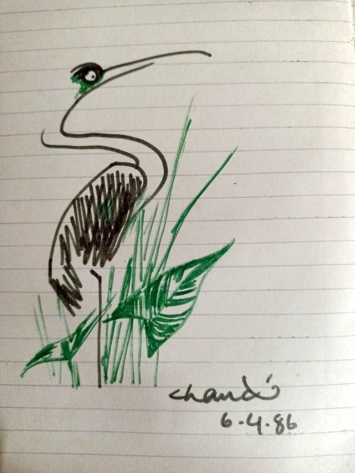 তাঁর বিশ্বাস নিয়ে প্রশ্ন তুললেও বিদায় বেলায় তাঁর দাক্ষিণ্য লাভে বঞ্চিত হইনি । আমার খাতাটি নিয়ে কয়েক লহমার কলম চালনায় এঁকে দিয়েছিলেন সারস পাখীর একটি নয়নাভিরাম স্কেচ । ছবির মতই তাঁর অতি পরিচিত Chandi স্বাক্ষর সহ 6.4.86 তারিখটা আজও জ্বলজ্বল করছে খাতার পাতায় ও আমার স্মৃতির গহনে ।